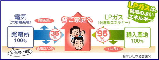 省エネの度合いを測るのには、「利用効率」が用いられます。電力の場合、発電時に60%、送電時に5%のエネルギーが損失をだすので、家庭で利用できるのは実は35%だけ。一方、LPガスがご家庭で使用されるまでのロスはわずか5%。95%ものエネルギーをそのまま使えるLPガスは、とても利用効率の高い”地球に優しい”エネルギーと言えます。